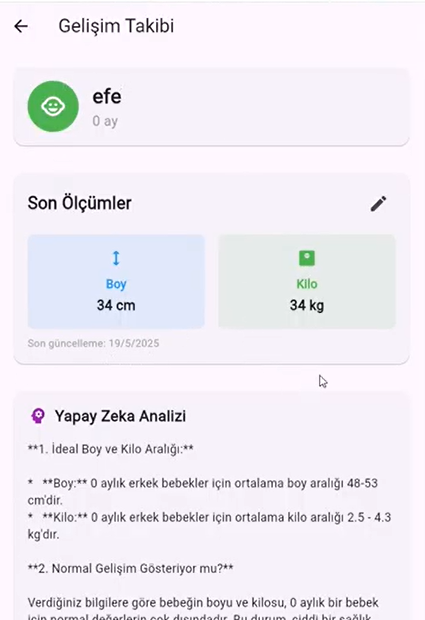 Bu projede, çocuk büyütme sürecini kolaylaştırmayı hedefleyen bir mobil uygulama geliştirildi. Uygulama Flutter ile tasarlandı ve kullanıcı dostu, sade bir arayüz ile ebeveynlerin bebek gelişim süreçlerini kolayca takip edebilmesine olanak tanıdı. Projenin backend kısmında Python ile bir yapay zekâ modeli geliştirildi ve Flask API aracılığıyla mobil uygulamaya entegre edildi. Modelin uzaktan erişilebilir hale getirilmesi için ngrok kullanıldı. Ayrıca yöneticilere özel bir kontrol alanı sağlamak amacıyla bir admin paneli tasarlandı. Bu panel, React, TypeScript ve Tailwind CSS kullanılarak geliştirildi ve Firebase üzerinden veri çekilerek dinamik içerik yönetimi sağlandı. Proje hem mobil hem de web tabanlı bileşenleriyle uçtan uca bir sistem yapısına sahiptir.
