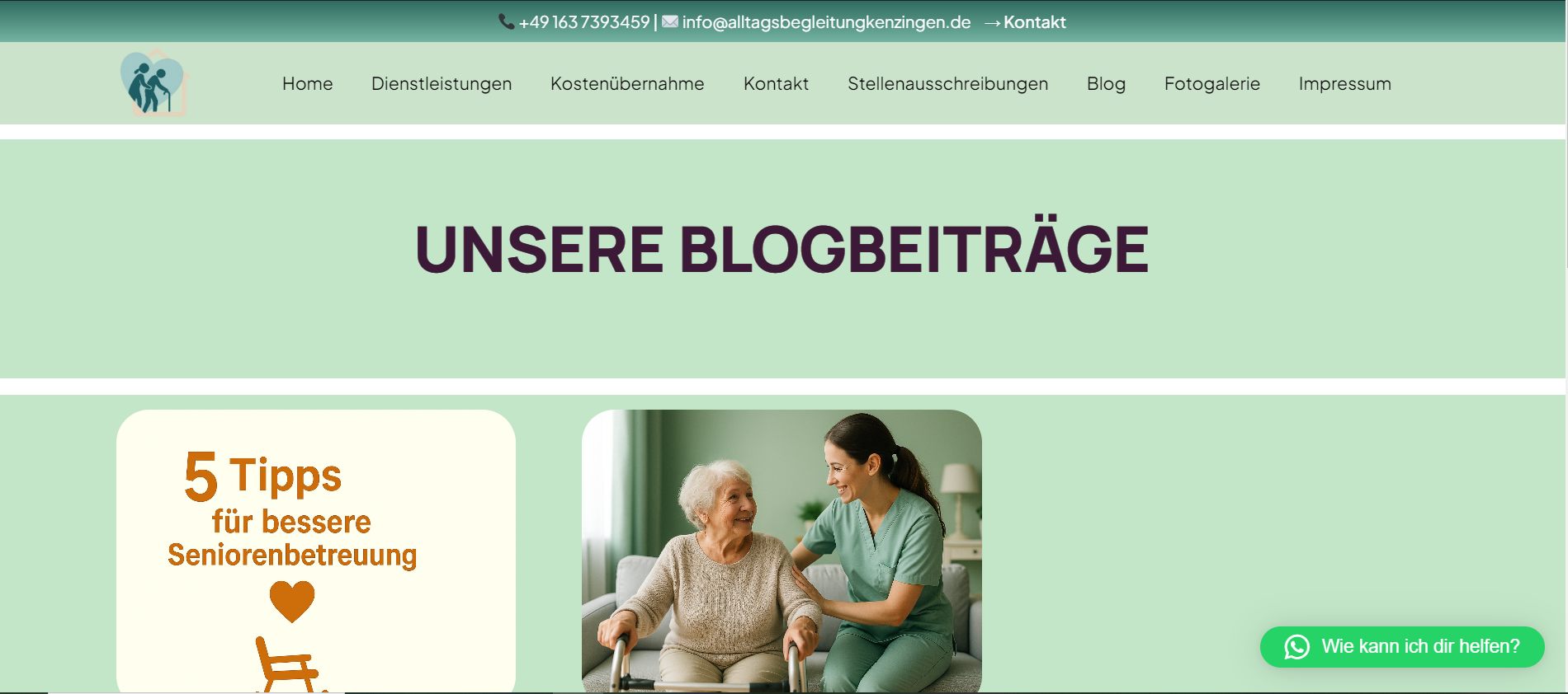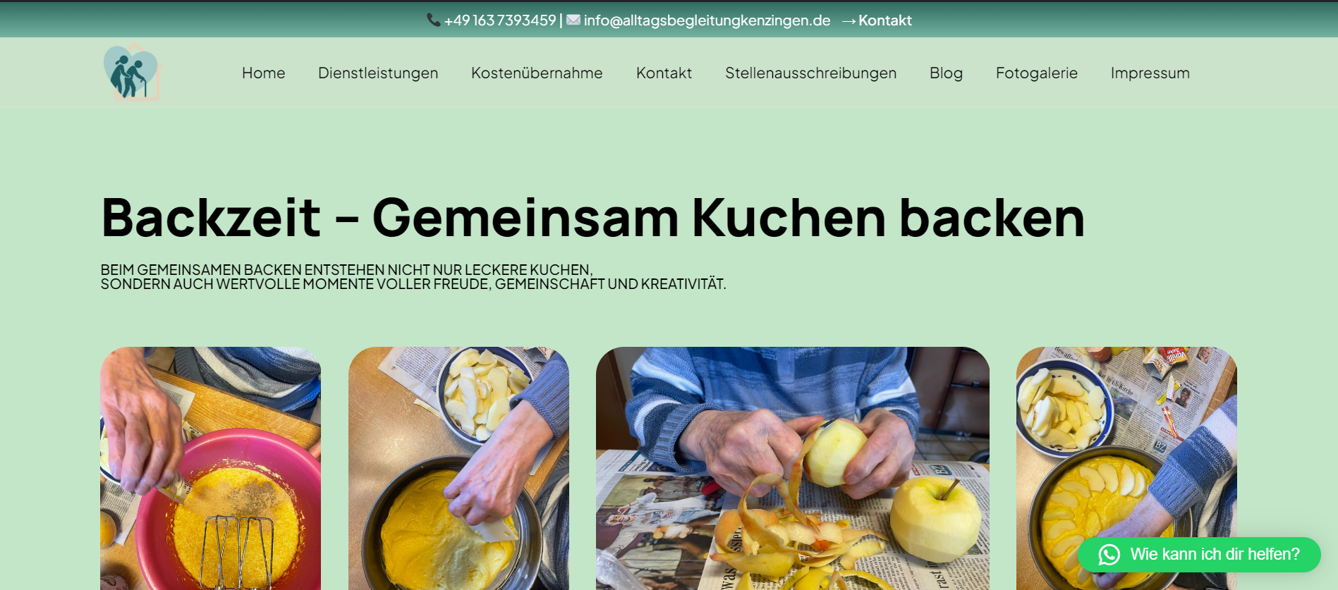 Almanya Kenzingen bölgesinde yaşlı bakım ve günlük destek hizmetleri sunan bir kurum için modern, güvenilir ve SEO uyumlu bir web sitesi geliştirdim. Tasarım, içerik, performans optimizasyonu ve güvenlik tarafını baştan sona yöneterek kurumsal kimliğe uygun, kullanıcı dostu bir yapı oluşturdum.